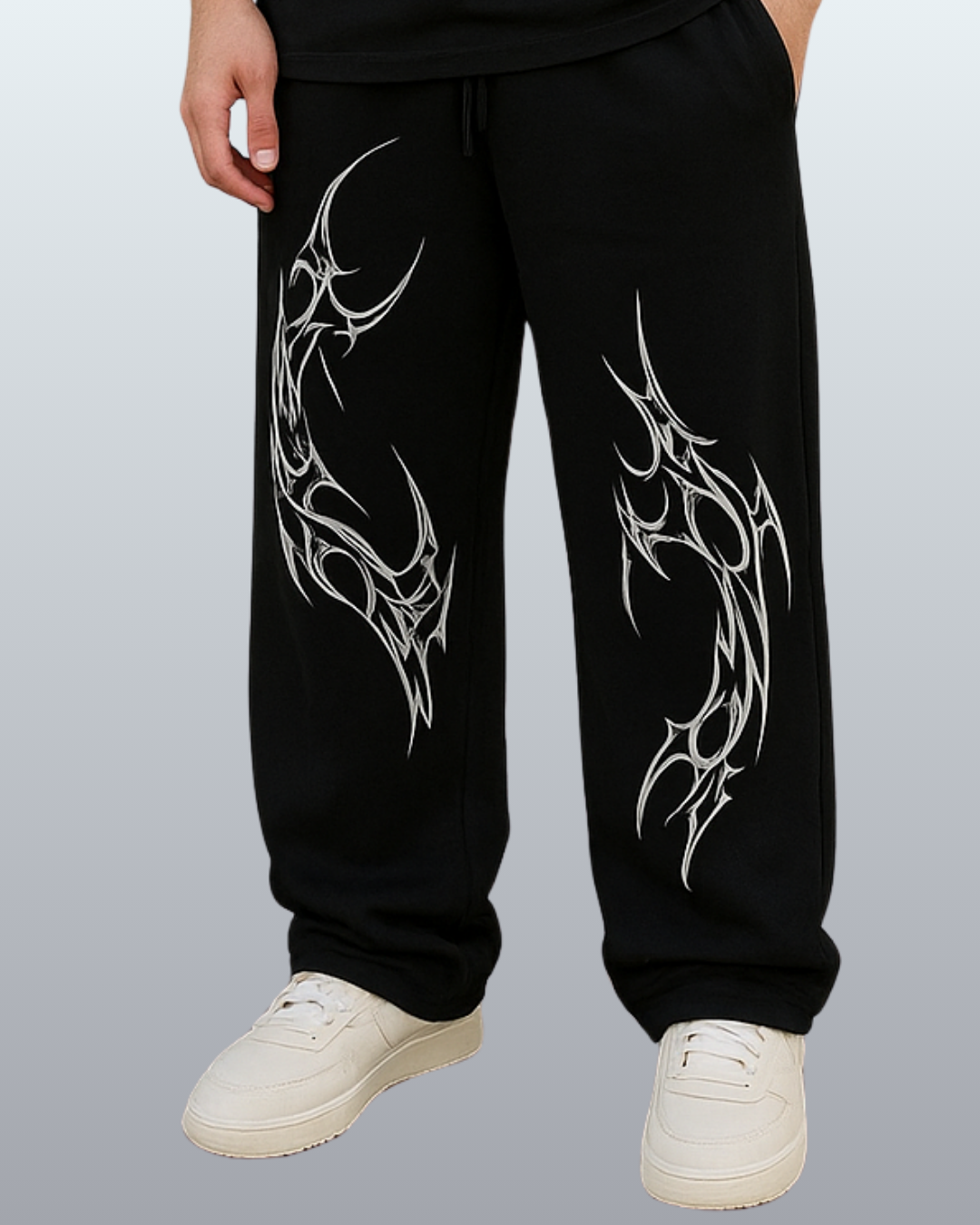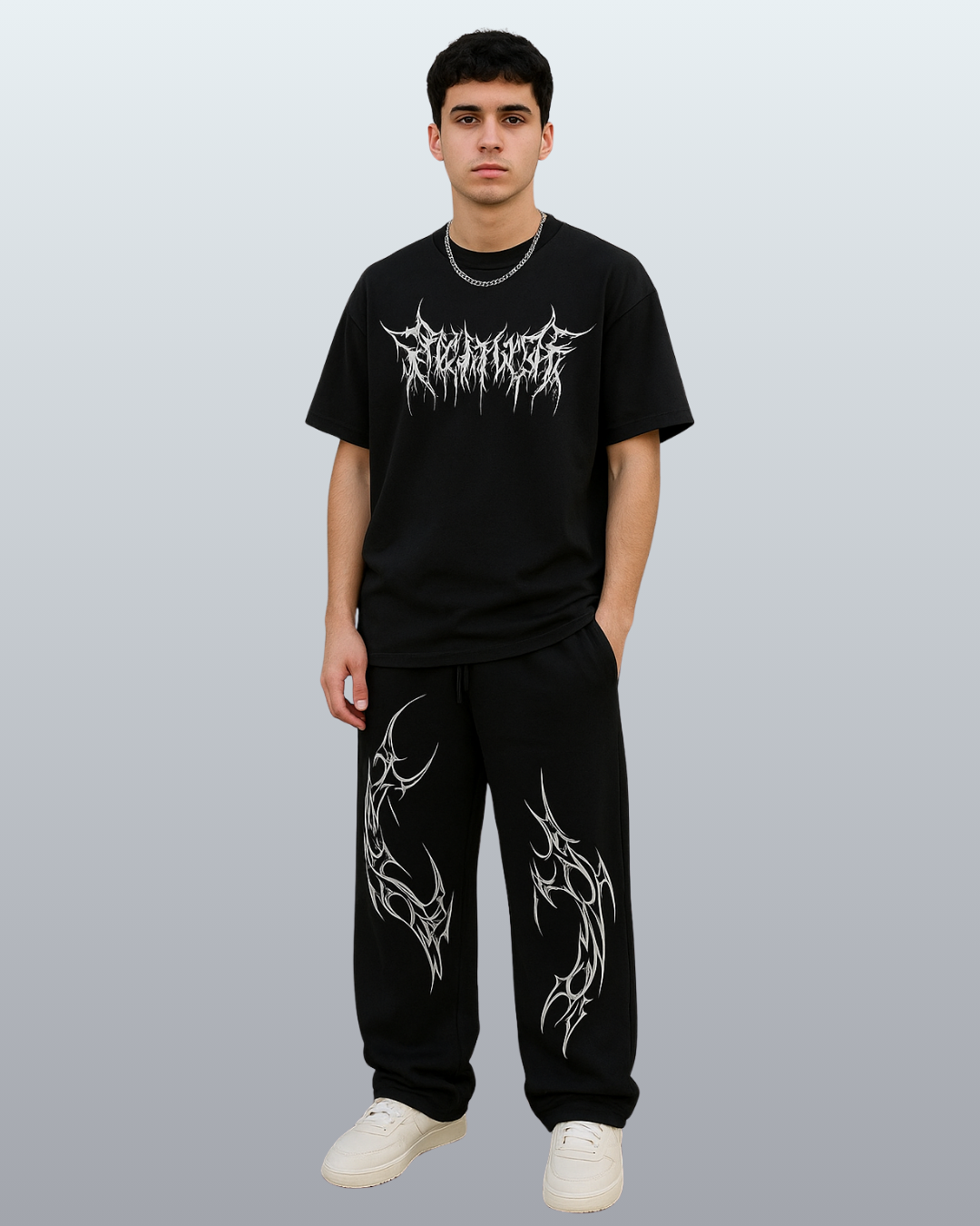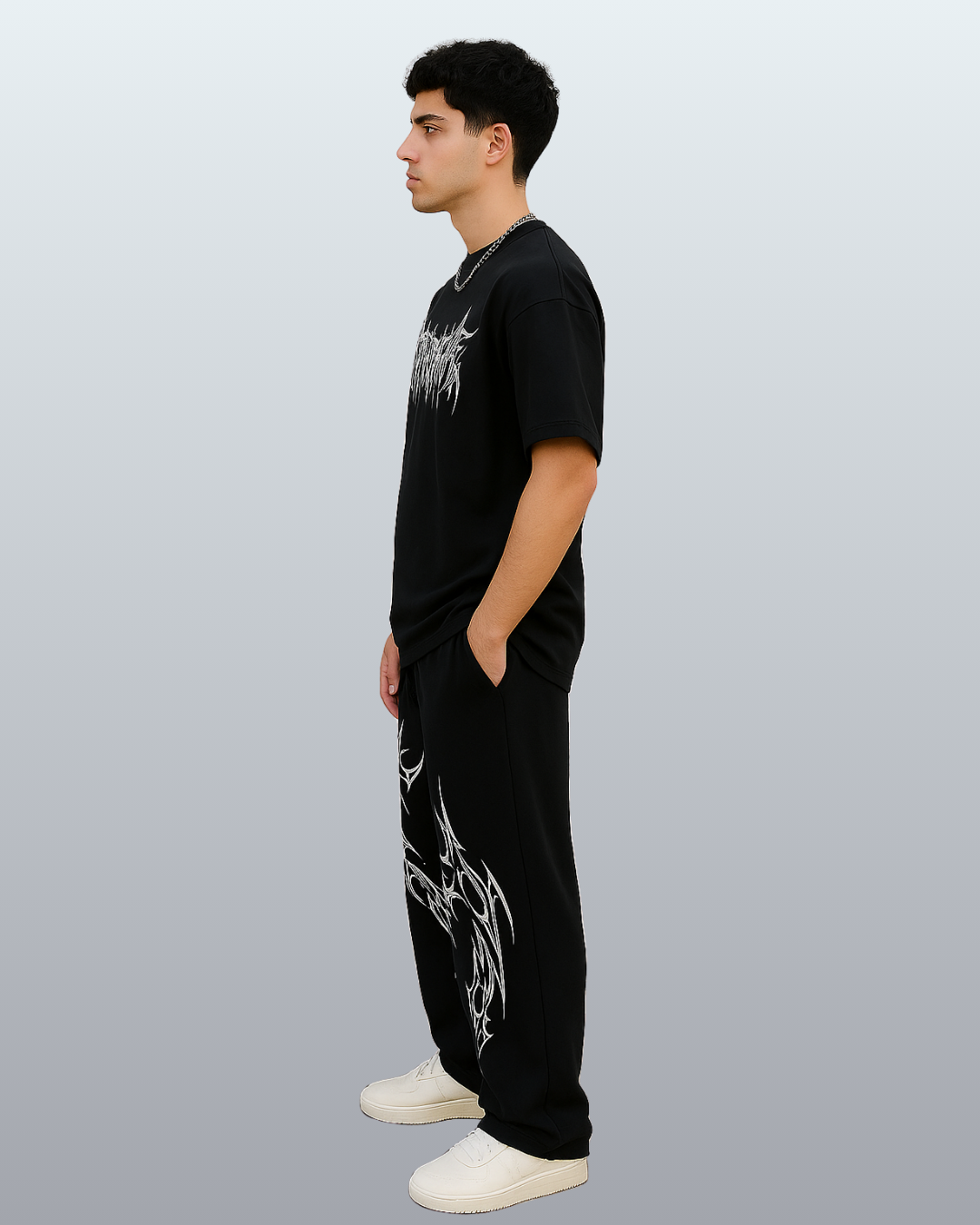 Elevate your streetwear game with this Black Tribal Graphic Co-ord Set, featuring a bold gothic print tee paired with matching joggers. The premium cotton-blend fabric ensures comfort and breathability, while the relaxed fit gives off a confident, laid-back vibe. The intricate tribal flame design adds an edgy aesthetic, perfect for those who like to stand out in urban fashion. Ideal for casual outings, parties, or everyday street style.